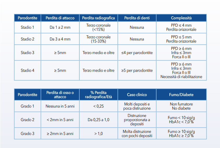 La malattia parodontale si sviluppa in fasi progressive e può variare in gravità. La fase iniziale viene chiamata gengivite. La gengivite definisce l’infiammazione delle gengive, causata dalla placca batterica accumulata sulla superficie dei denti e negli spazi interdentali per un periodo più lungo. I sintomi includono gengive rosse, gonfiore e sanguinamento. La gengivite è ancora reversibile. Ciò significa, che con una corretta igiene orale, può essere curata completamente, senza causare danni permanenti ai tessuti circostanti dei denti. Una terapia avviata tempestivamente può curare completamente questo stadio senza causare danni permanenti all’apparato di supporto dentale. Invece, se la placca non viene rimossa accuratamente, l’infiammazione si diffonde in profondità (tra il dente e la gengiva) e distrugge il tessuto molle e l’osso mascellare circostante. La reazione difensiva del corpo degrada il tessuto più profondo, portando alla parodontite. Senza un’adeguata terapia, questo processo continua fino alla perdita dei denti a causa dell’allentamento grave. I sintomi della parodontite possono includere i sintomi della gengivite, l’alito cattivo, gengive ritirate, pus e denti mobili. Secondo la classificazione attuale, la parodontite viene suddivisa in stadi e gradi. Questi descrivono la gravità, la complessità, l’estensione e la distribuzione, nonché la velocità di progressione della malattia. Inoltre, vengono considerati fattori di rischio come il fumo e il diabete mellito. Grazie a questa nuova classificazione, è possibile pianificare individualmente il trattamento adatto al paziente.